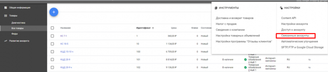 Дальше нужно связать аккаунт в Merchant Center с аккаунтом в рекламном кабинете Google Ads. Для этого нажимаю на значок настроек и кликаю на вариант «Связанные аккаунты».