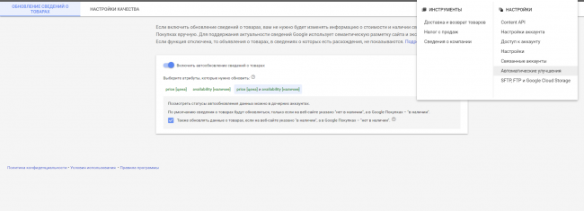 Не помешает подключить обновление сведений о товарах. Тогда Google будет автоматически обновлять перечень показываемых товаров на основании разметки сайта. Если в товарной карточке поменялась цена, в Google изменения будут внесены автоматически. Таким образом, после редактирования карточек не придется каждый раз обновлять фид в админке, а потом в Merchant Center.