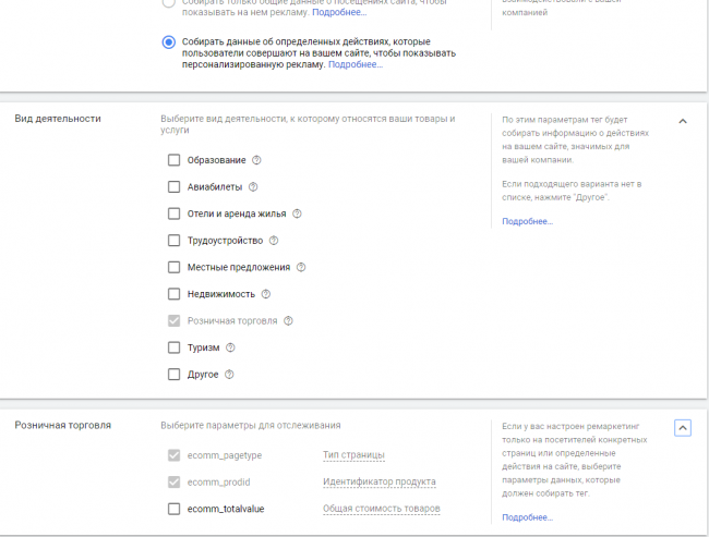 У меня есть возможность выбрать параметры отслеживания, но обычно при подключении нового тега все параметры из определенного вами вида деятельности выбраны в скрипте автоматически.