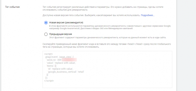 Далее размещаем у себя на сайте Global site tag (gtag.js) — Google Ads + тег события. Часть кода с параметрами будет выглядеть следующим образом: