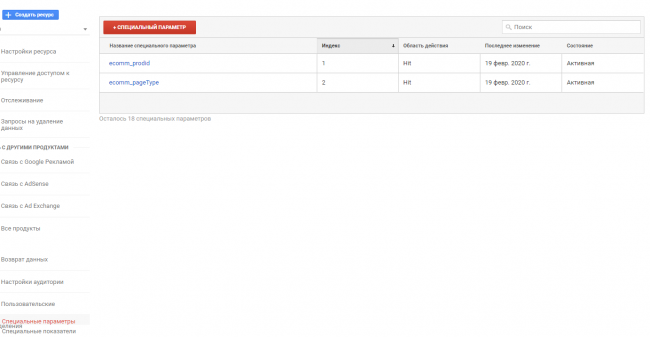 После размещения кода на сайте переходите в Google Analytics и пропишите параметры отслеживания в настройках ресурса во вкладке «Пользовательские определения» — «Специальные параметры».