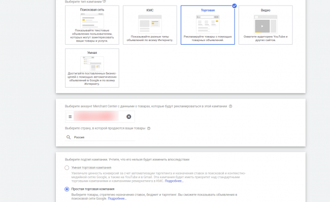 В качестве цели я выбираю «Продажи», тип кампании — «Торговая». Теперь автоматически подтягивается наш аккаунт из Google Merchant Center. Нелишним будет еще раз проверить соответствие.