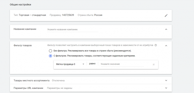 После добавления меток к фиду нужно указать значение в фильтре, выбрав нужный custom_label, а затем заполнить остальные настройки. Теперь торговая кампания готова.