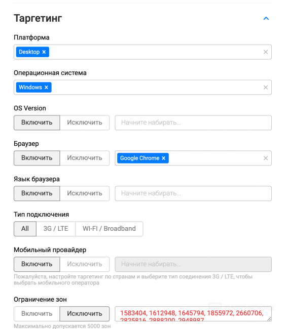 Настройки десктопной кампании были дефолтные (только браузер хром):