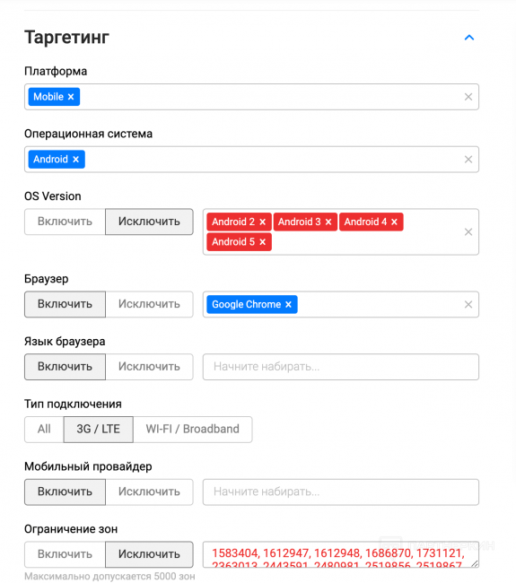 Что касается настроек по мобайлу, то я убрал все версии Android до 5, потому что у них самый плохой конверт.