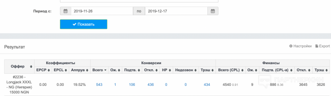 Перед запуском трафика настроил постбек для передачи лидов из партнерки в кабинет PropellerAds. Это нужно было для того, чтобы не используя трекер, оптимизировать Zone Id.