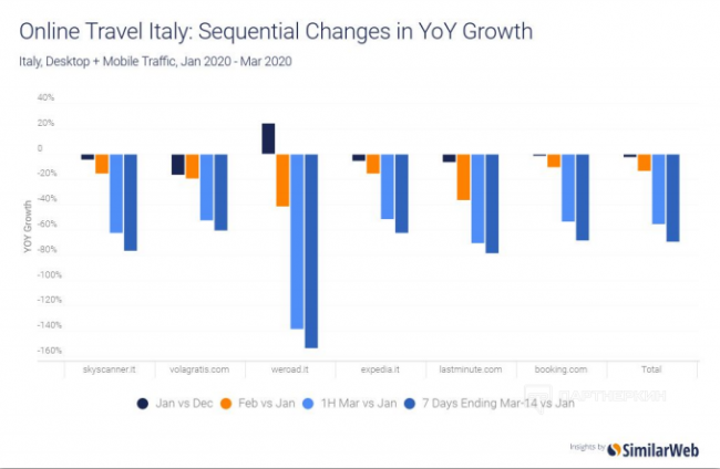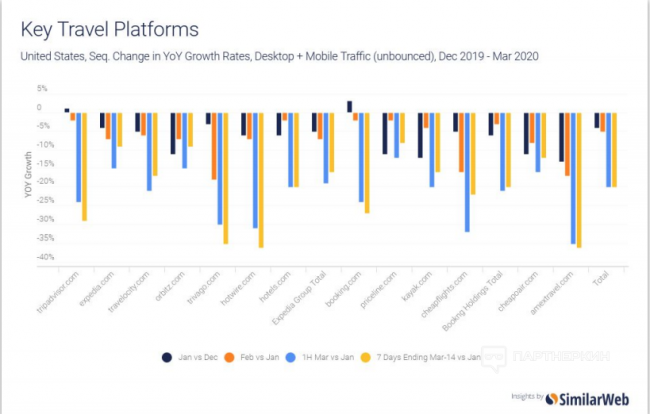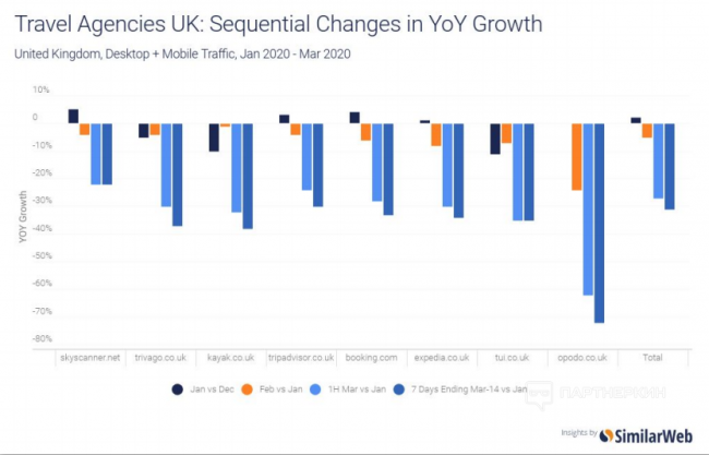Онлайн туристические платформы были повсеместно затронуты пандемией и тенденции ускорились во время второй недели марта. По состоянию на середину марта трафик снизился на более чем 30%. Британские сайты-агрегаторы по продаже билетов и бронированию отелей потеряли трафик от 25% до 70%: