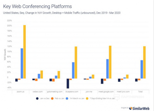 По мере того, как сотрудники все чаще работают из дома, растет популярность инструментов для веб-конференций, таких как Zoom. Тенденции ускорились в марте, показав рост трафика на 140%. Ниже показан рост по платформам для видеоконференций: