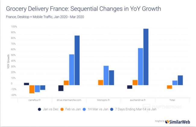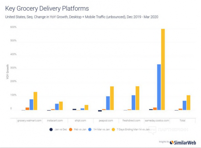 Платформы доставки продуктов испытывают значительный рост. В марте трафик вырос на 135%.