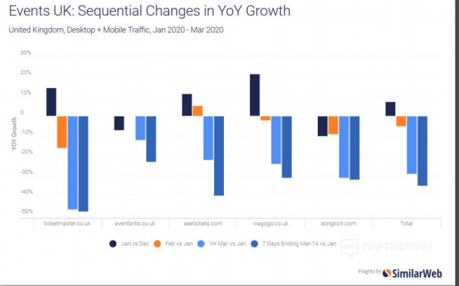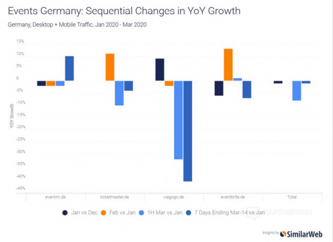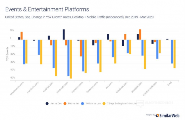 В то время как трафик на ивенты упал всего на 1%, некоторые платформы испытали рост. Это объясняется тем, что людям приходилось заходить на сайт, чтобы отменить билеты.