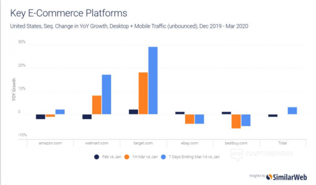 Ecommerce в США за последние месяцы показывает тренд на снижение. Трафик на товары для дома предсказуема выросла (до 30%). В то время как Ebay и BestBuy теряют трафик, Amazon и сети гипермаркетов Target и Walmart ощутили рост посетителей на свои сайты:
