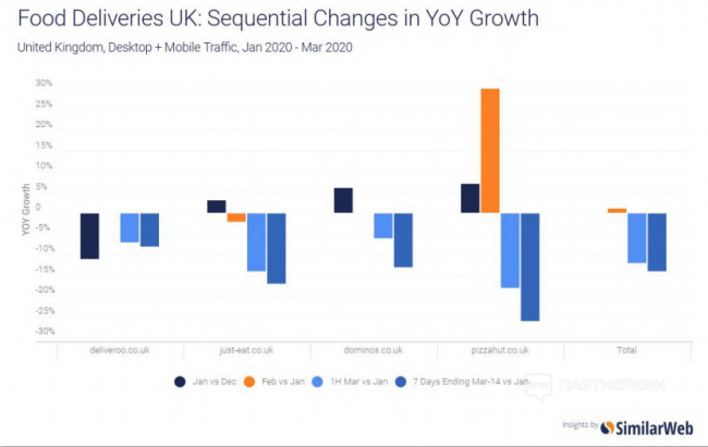 Как мы видим на графике ниже, сильнее всего пострадали британские сервисы доставки пиццы: