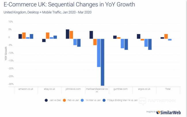 Торговые площадки испытывают смешанные тенденции. В то время как магазины одежды столкнулись со снижением трафика, Boots, интернет-аптека, получила значительный положительный рост трафика более 50%.