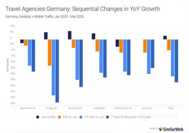 Трафик в нише упал сразу после первых негативных заголовков в новостях. Эти негативные тенденции более серьезны, чем те, которые наблюдаются в других странах. В то время как в США трафик на туристические сайты упал на 20% во второй неделе марта, немецкий трафик упал более чем на 35%.