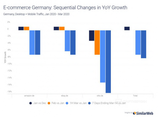 Все крупные площадки электронной коммерции страны столкнулись с падением трафика до 18%. Магазины модной одежды, такие как Zalando, на второй неделе марта потеряли более 30% трафика и, судя по всему, это еще не предел.