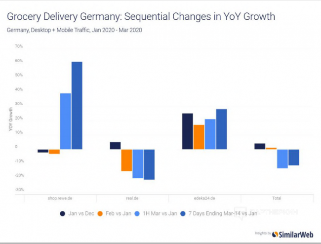 Наблюдаются неоднородные тенденции в молодом секторе доставки продуктов в Германии. Некоторые бренды доставки продуктов извлекают выгоду из этого периода и наращивают трафик, в то время как крупные бренды (real.de) теряют свои позиции.