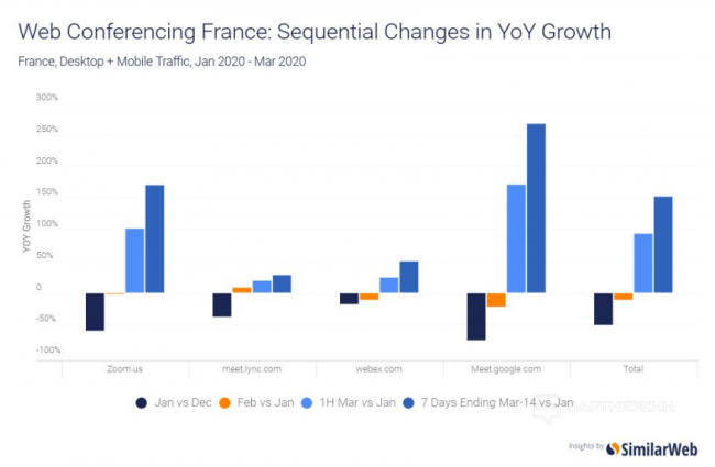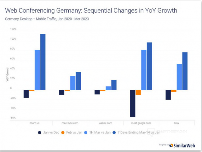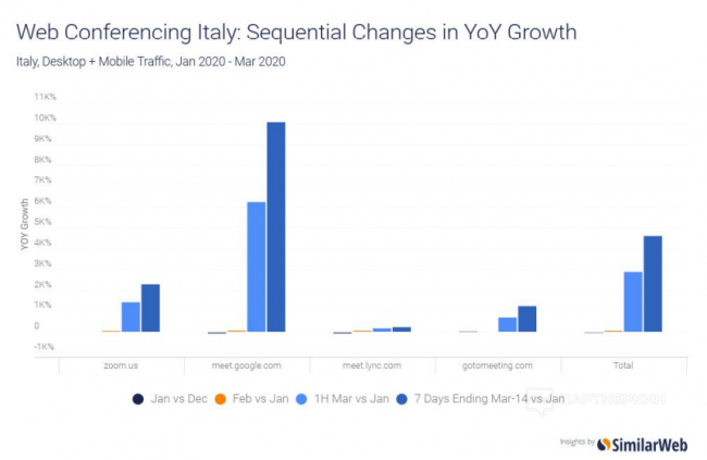 Хотя в этой нише рост не такой впечатлительный как в Италии, все равно сервисы для видеоконференций получили на 100% больше посещений.