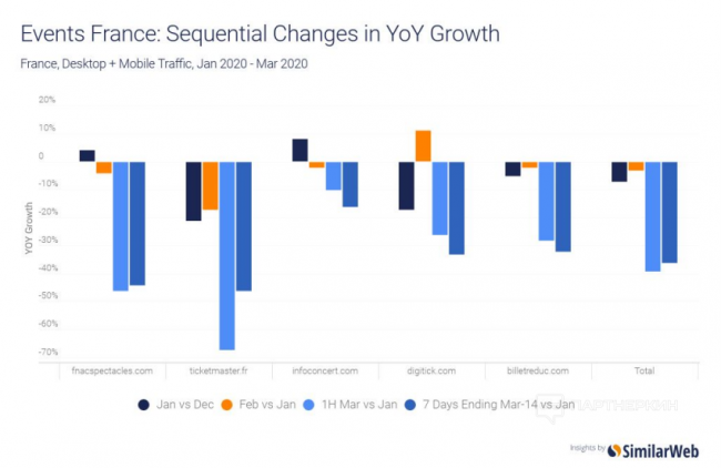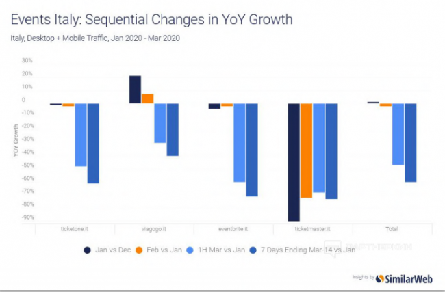 Similarweb показывает, что некоторые сайты по продаже билетов потеряли почти 70% трафика по сравнению с январем: