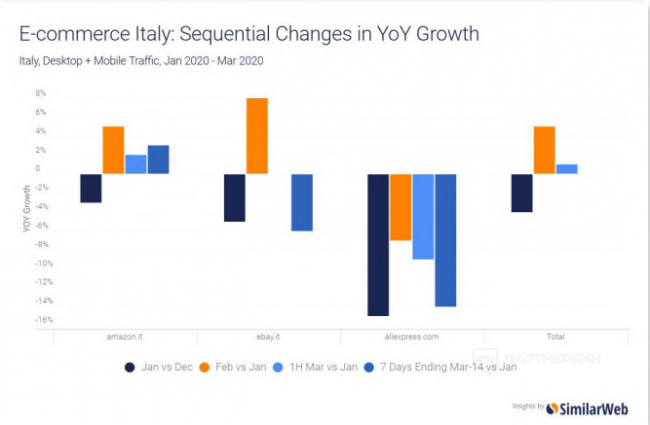 Платформы электронной коммерции в Италии столкнулись с довольно интересными расхождениями. На данный момент потребители Италии продолжают использовать Amazon, в то время как посещение китайского сайта Aliexpress резко упало. Это может быть частично связано с опасениями по поводу зараженности товаров из Китая.