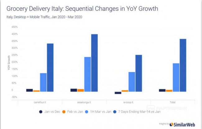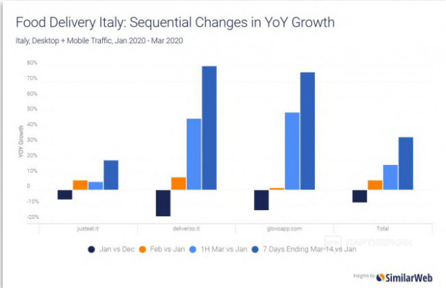 Как и в остальном мире, платформы доставки продуктов в Италии испытывают значительное увеличение трафика, так как люди вынуждены сидеть дома. Трафик на доставку продуктов вырос почти на 400%.