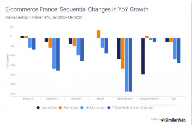 Электронная коммерция во Франции, в отличие от Италии, оказался предсказуемым. Трафик упал во всех платформах (в целом 15%), лидером среди которых стал AliExpress с 28%.