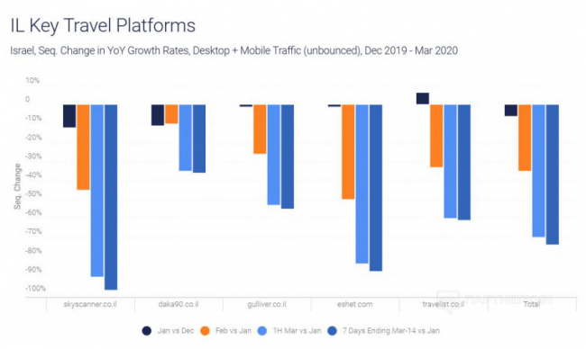 Падение трафика в Travel-нише Израиля заметнее, чем во многих остальных странах. На начало марта авиакомпании потеряли 70% трафика, а туристические агентства — более 30%. Спрос на аренду авто через сервисы упал на более чем 50%.