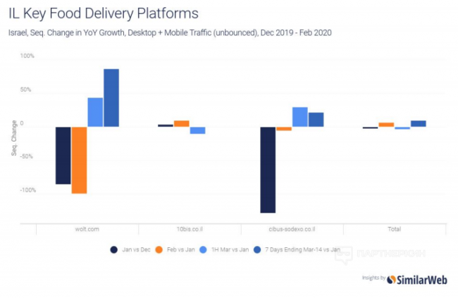 Что интересно, хотя волна коронавируса достигла Израиля одним из первых в регионе, доставка еды в плане трафика также до сих пор в небольшом плюсе.