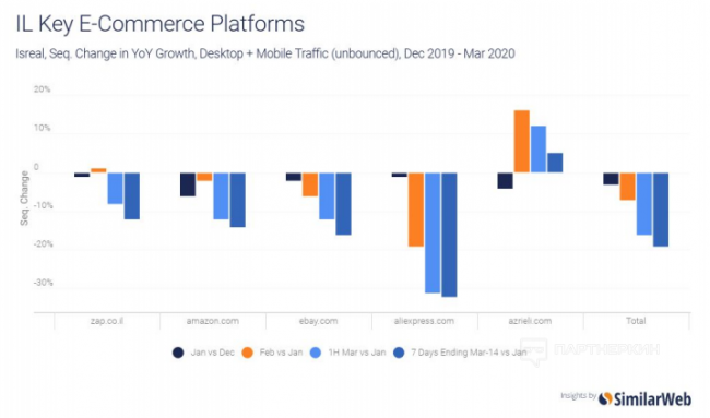 Игроки электронной коммерции в Израиле испытывают в основном тенденции к снижению. Aliexpress, который очень популярен у израильтян, испытывает наибольший спад. Azrieli.com, единственный сайт, не теряющий трафик, недавно запустил агрессивные акции перед пасхой, чем и держит внимание потребителей.