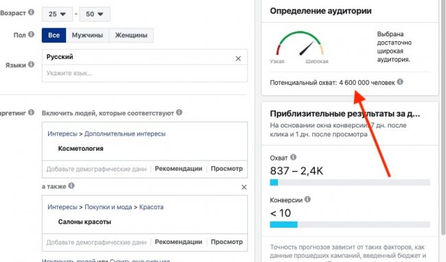 Если выберем в рекламном кабинете Facebook «Детальный таргетинг» по интересам, связанным с косметологией, то не найдем нужную нам аудиторию. Вместо этого мы охватим всех людей, которые интересовались косметологией или подписаны на косметолога или клинику, и это довольно широкая аудитория! Запускать на нее рекламу — как стрелять по воробьям.