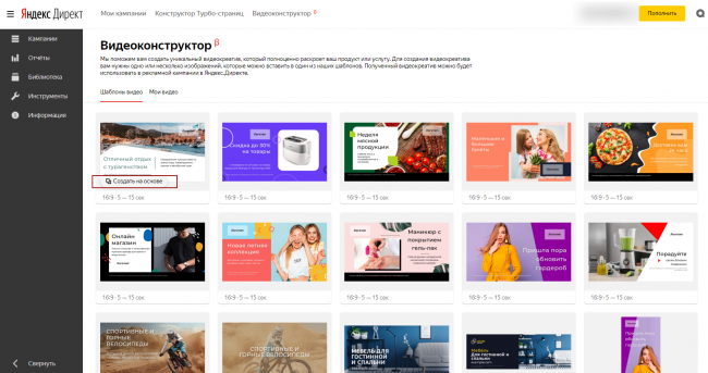 Сейчас видеоконструктор работает в режиме открытого бета-тестирования. В инструменте доступны шаблоны, адаптированные для разных тематик бизнеса, на их основе можно создавать ролики. Видео собирается из статичных изображений, загрузить готовый видеофайл пока нельзя, хотя в будущем Яндекс обещает добавить такую возможность. Итак, рассмотрим подробнее.