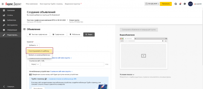 Чтобы использовать созданный ролик в объявлении, начните создавать медийную кампанию или видеообъявление в текстово-графической кампании. При создании креатива выберите «Сконструировать по шаблону».