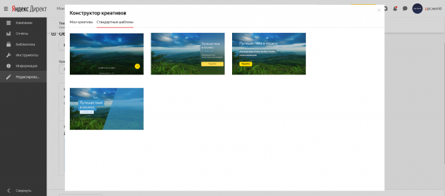 Для начала перейдем в конструктор из вкладки «Инструменты» в интерфейсе Директа или из верхней панели.