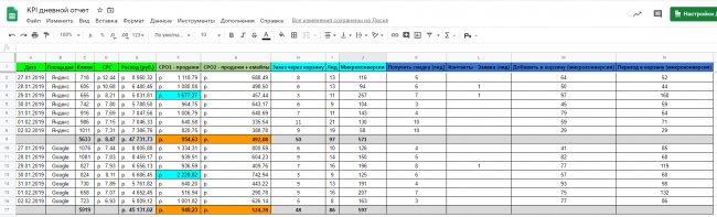Надеюсь, суть ясна. Сводим данные, которые есть в бесплатной аналитике (чтобы все заработало, у вас должны быть корректно настроены цели, стоять UTM и т. п.), со статистикой из кабинетов Яндекс.Директа, Google Ads и других платных площадок — и получаем вполне себе рабочий отчет, в который можно добавить данные, играющие ключевую роль в вашей задаче.