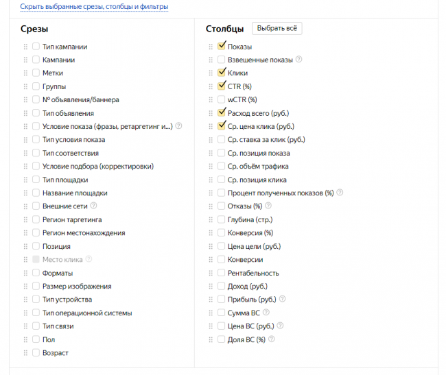 Какие еще параметры можно добавлять в отчет? Да в принципе все, что есть в типовых и кастомных отчетах систем контекстной рекламы, например, из Мастера отчетов Директа: