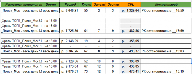 Если нужно больше параметров, добавляйте дополнительные столбцы. Задача отчета выше — помогать вам держать руку на пульсе и видеть всю динамику. А это важно в тактике рекламных кампаний и принятии ежедневных решений.