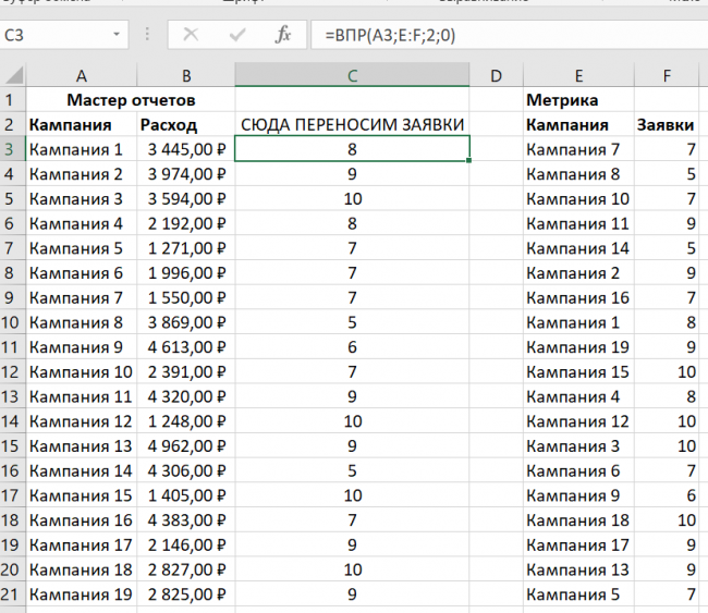 Проблема в том, что много РК (могут быть и фразы, и источники, и другие параметры, может быть что-то пропущено или наоборот: что-то, где нет конверсий). Задача — перенести данные по конверсиям в столбец C.