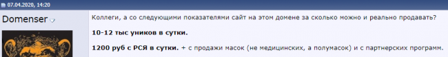 Что касается заработка, то за сутки сайт на домене коронавирус.рф приносил 1 200 рублей + продажа масок + партнерские программы (здесь, скорее всего, не самая большая сумма). Количество уников — 10 000-12 000 в сутки: