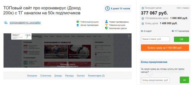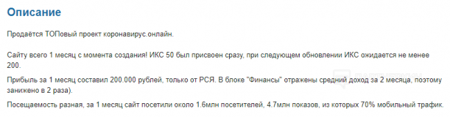 Результаты неплохие, однако сайту еще есть куда стремиться. Например, к следующему проекту — сайт coronavirus-monitor.ru. На том же Telderi есть примечательный лот. Если взглянуть на его описание, можно предположить, что это и есть сайт coronavirus-monitor.