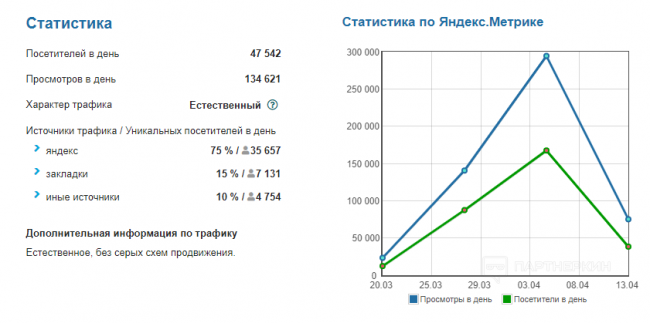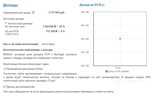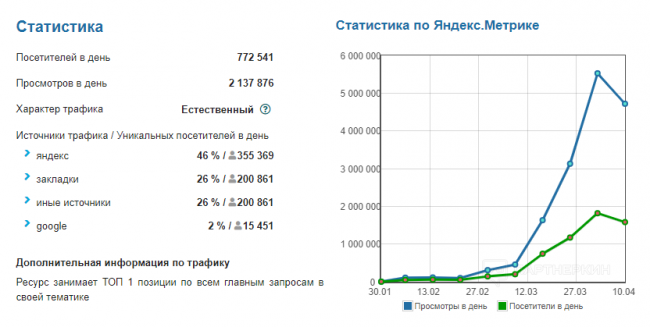 Как указывается в описании, за 1 месяц прибыль составила 200 000 рублей (и это только от РСЯ), а количество посетителей составило 1,6 миллионов пользователей.