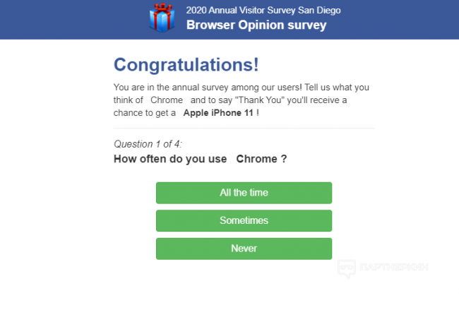 Для свипов преленды или проклы просто необходимы! Главное — убедить свою аудиторию в том, что им просто необходимо испытать удачу и получить огромную возможность для выигрыша. Трафик был направлен на прелендинг с опросником и только потом на смартлинки.
