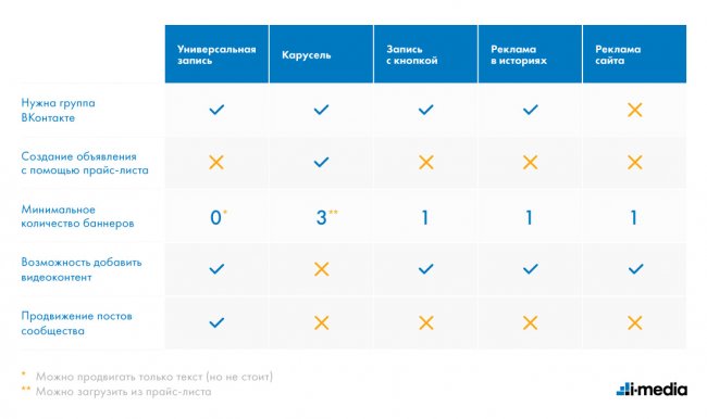 Для начала нужно решить, какую именно рекламу показывать. «ВКонтакте» дает рекламодателю большой выбор — в его распоряжении аж девять форматов. По нашему опыту, для e-commerce проектов подходят: карусель, запись с кнопкой, универсальная запись, реклама в Историях и реклама сайта. Остальные форматы менее релевантны целям маркетплейсов и интернет-магазинов, а потому обычно показывают меньшую эффективность и более высокий CPO.