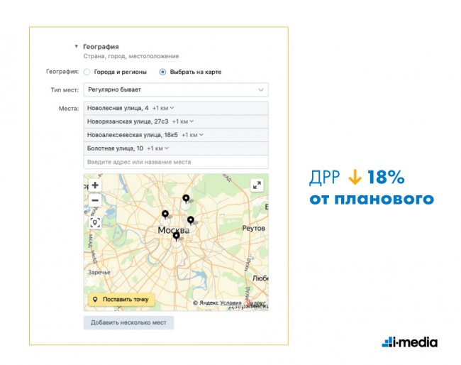 Этот тип таргетинга дает возможность показывать рекламу пользователям, которые бывают рядом с вашими точками офлайн-продаж.