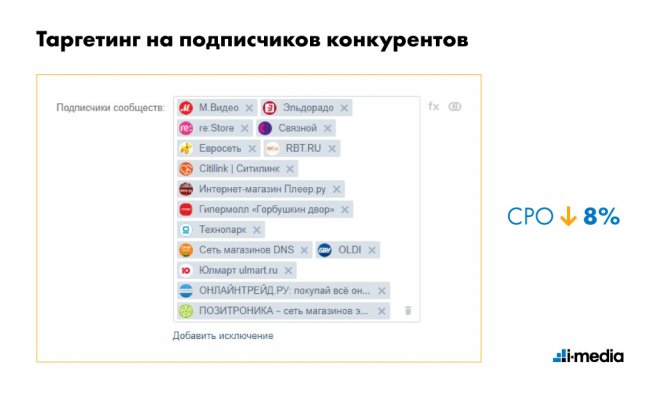 Мы тестировали таргетинг на подписчиков тематических сообществ и на подписчиков конкурентов для крупного маркетплейса. CPO рекламы со вторым вариантом таргетинга оказался ниже на 8%. Если сравнивать со средними показателями кампании с теми же креативами, то CPO был ниже на 7% для тематических сообществ и на 15% — для сообществ конкурентов.