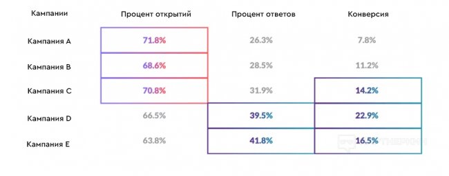 Это очень полезный способ анализа кампаний. На примере кампании Е мы видим, что несмотря на высокий процент конверсий, открытия письма оставляют желать лучшего. Вероятнее всего, заголовок данного письма — отстой. И в обратную сторону для кампании A — заголовок крутой, а над предложением стоит поработать.