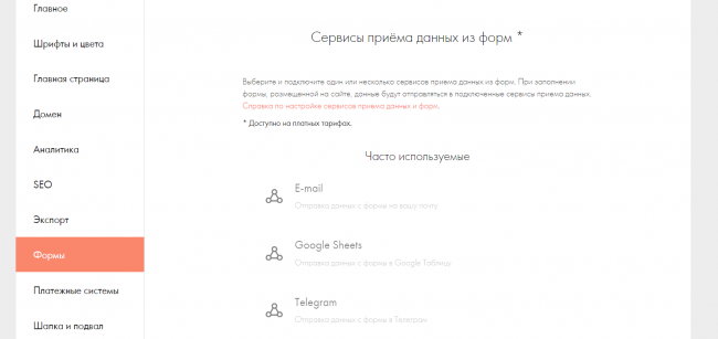 - Подключить нужный приемщик данных к конкретной форме. Для одной формы можно подключить сразу несколько приемщиков. Например, данные придут в Telegram и также сохранятся в Google Таблице.