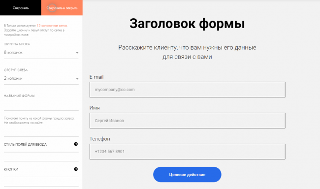 - Создать форму. В Tilda есть разные варианты форм (pop-up, форма с множеством полей, вшитая в страницу, форма с поэтапным заполнением). Внешний вид формы — шрифт, цвет, размер и т. д. — можно настроить.