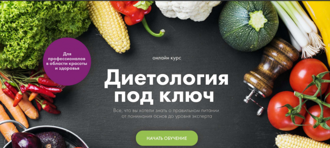 Основная идея — диетология под ключ — выделена крупным шрифтом. Кнопка призыва к действию и стикер с указанием аудитории — второстепенные, тонкий шрифт и буквы меньшего размера. Остальные текстовые элементы третьестепенные, поэтому они еще менее заметны.