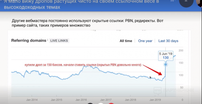 Нашли много интересного. Куча скрытых PBN, редирект со старого сайта на новый с переносом контента и многоуровневая прокачка ссылками. По итогу: рост сайта слабо связан с покупкой дропа.