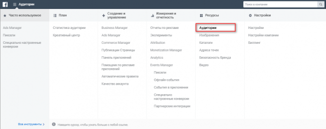 Но к сожалению, в Facebook исключить пользователей, уже видевших рекламу, нельзя, поэтому нам приходится следить за таким параметром, как наложение аудиторий. Для этого переходим в раздел «Аудитории»: