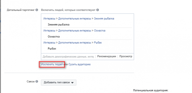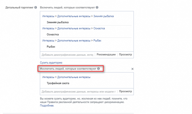 Если аудитории пересекаются на 15–20%, то я просто исключаю интересы одной аудитории из другой при помощи инструмента «Исключить людей»: